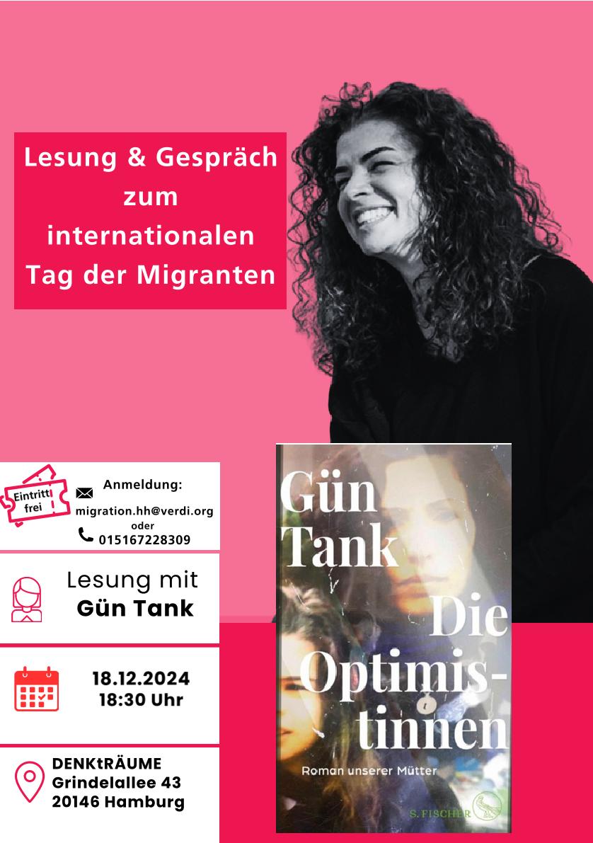 Die Autorin Gün Tank liest aus ihrem Roman Die Optimistinnen und spricht über die Lebenswelten von Frauen, die in den 1970er Jahren als sog. Gastarbeiterinnen nach Deutschland kamen. Viele junge Frauen kamen aus Ländern wie der Türkei, Spanien, Italien, Griechenland oder Marokko nach Deutschland. Sie arbeiteten in Fabriken, lebten in Wohnheimen und kämpften für bessere Arbeitsbedingungen. Ihre Geschichten sind ein wichtiger Teil unserer Gesellschaft – doch oft wurden sie vergessen.